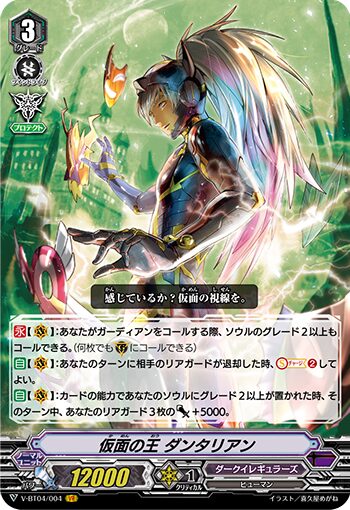 ダンタリアンはソウルからグレード2以上になりますが、ガーディアンとしてコールできます。さらに相手リアガードを退却させるとソウルチャージ2を得、グレード2以上のカードがソウルに送られると他のカード3枚の攻撃力を上げてくれます。