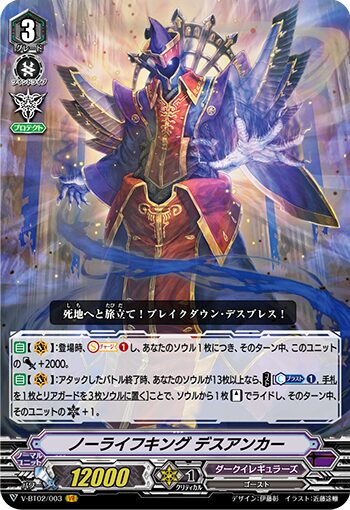 最初に紹介するのがノーライフキング・デスアンカー。こちらの特徴はまず、登場時に自身の攻撃力をそのターンの間だげ上げてくれます。また条件は厳しいですが、満たすと、ターン内でスタンドした状態でライド出来、さらにクリティカルを上げてアタックすることが出来ます。つまり、同ターン内でドライブ付き攻撃が2回出来ます。条件が厳しいので最後のフィニッシュ前のカードといった立ち位置になるでしょうか、ライド2の状態からライドするカードではないかなと思います。他のグレード3のカードでうまく立ち回りつつ、最後にライドするといった使い方になると思います。ライドするカードは何が良いでしょう?