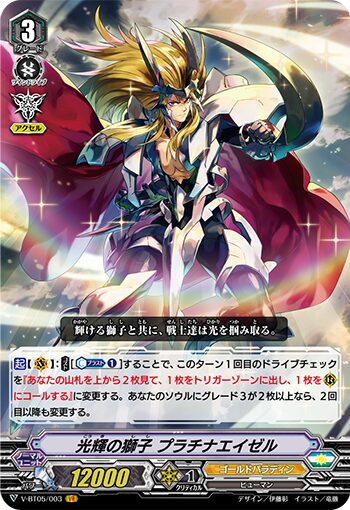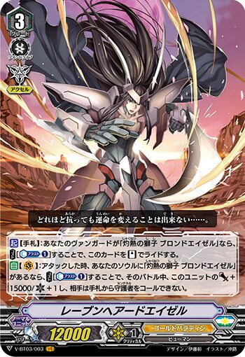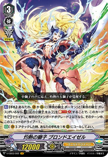 【自】V:アタックした時、あなたのソウルに「灼熱の獅子 ブロンドエイゼル」があるなら、(コスト)ブラスト①することで、そのバトル中、このユニットのパワー+15,000/クリティカル+1し、相手は手札から守護者をコールできない