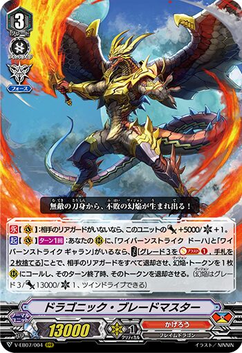 【起】V(ターン1回):あなたのRに「ワイバーンストライク ドーハ」と「ワイバーンストライク ギャラン」がいるなら、(コスト)【グレード3をブラスト①、手札を2枚捨てる】ことで、相手のリアガードをすべて退却させ、幻焔・トークンを1枚Rにコールし、そのターン終了時、そのトークンを退却させる。(幻焔はグレード3、パワー13,000、クリティカル1、ツインドライブできる)