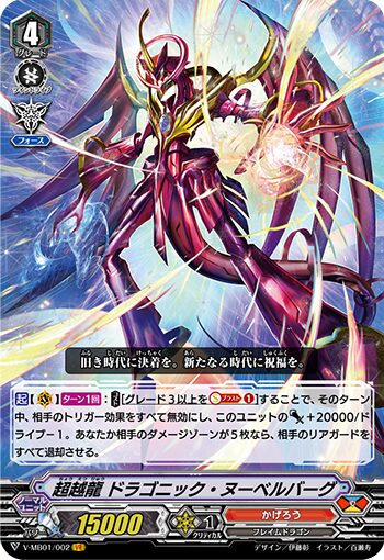 【起】V(ターン1回):(コスト)【グレード3以上をブラスト①】することで、そのターン中、相手のトリガー効果をすべて無効にし、このユニットのパワー+20,000/ドライブー1。あなたのダメージゾーンが5枚なら、相手のリアガードをすべて退却させる