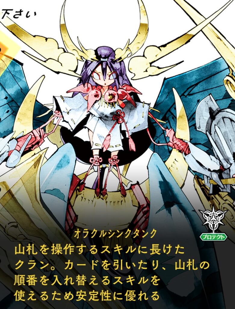 山札を操作するスキルに長けたクラン。カードを引いたり、山札の順番を入れ替えるスキルを使えるため安定性に優れる